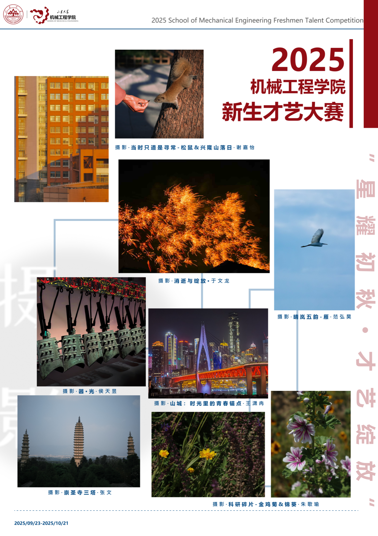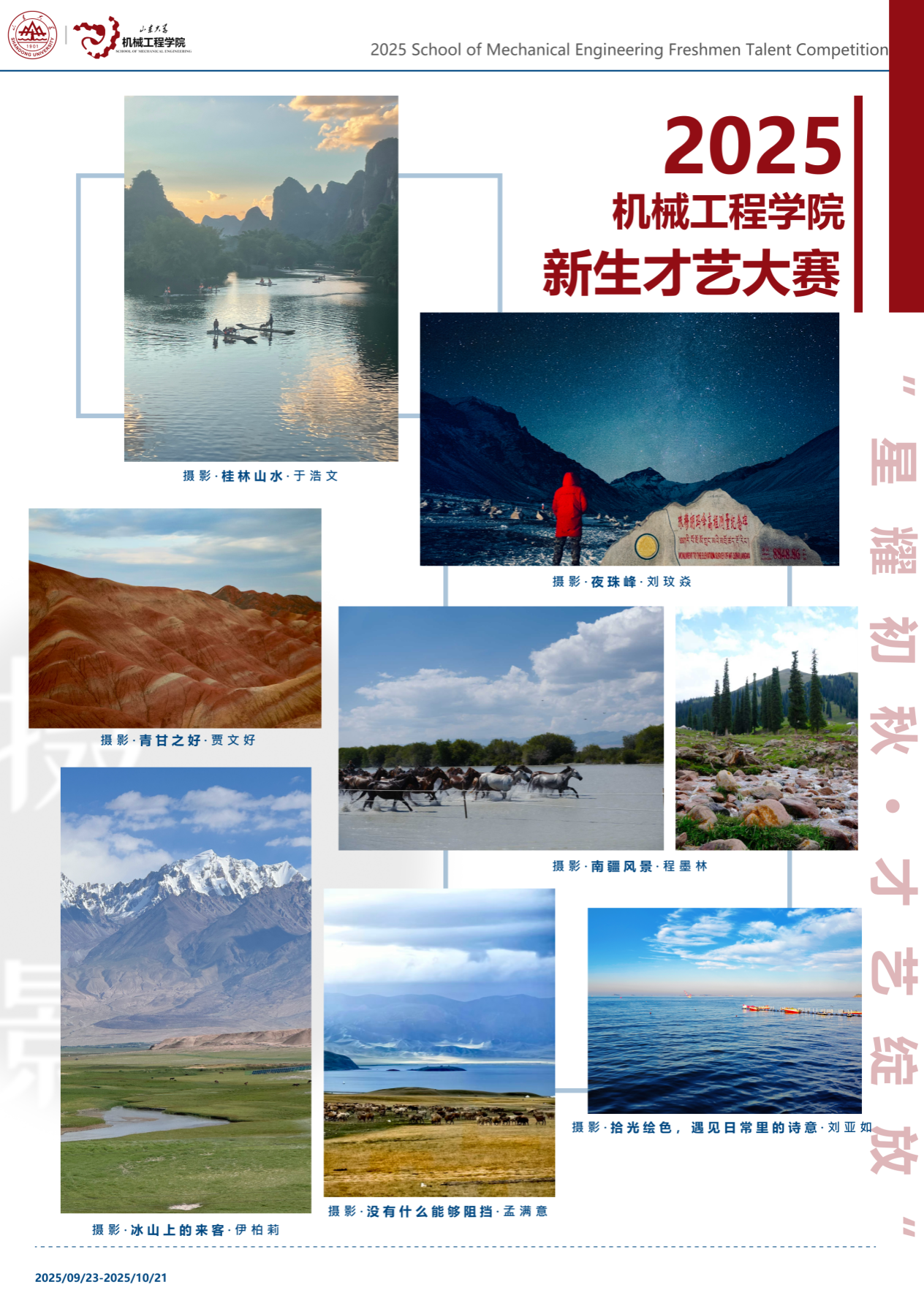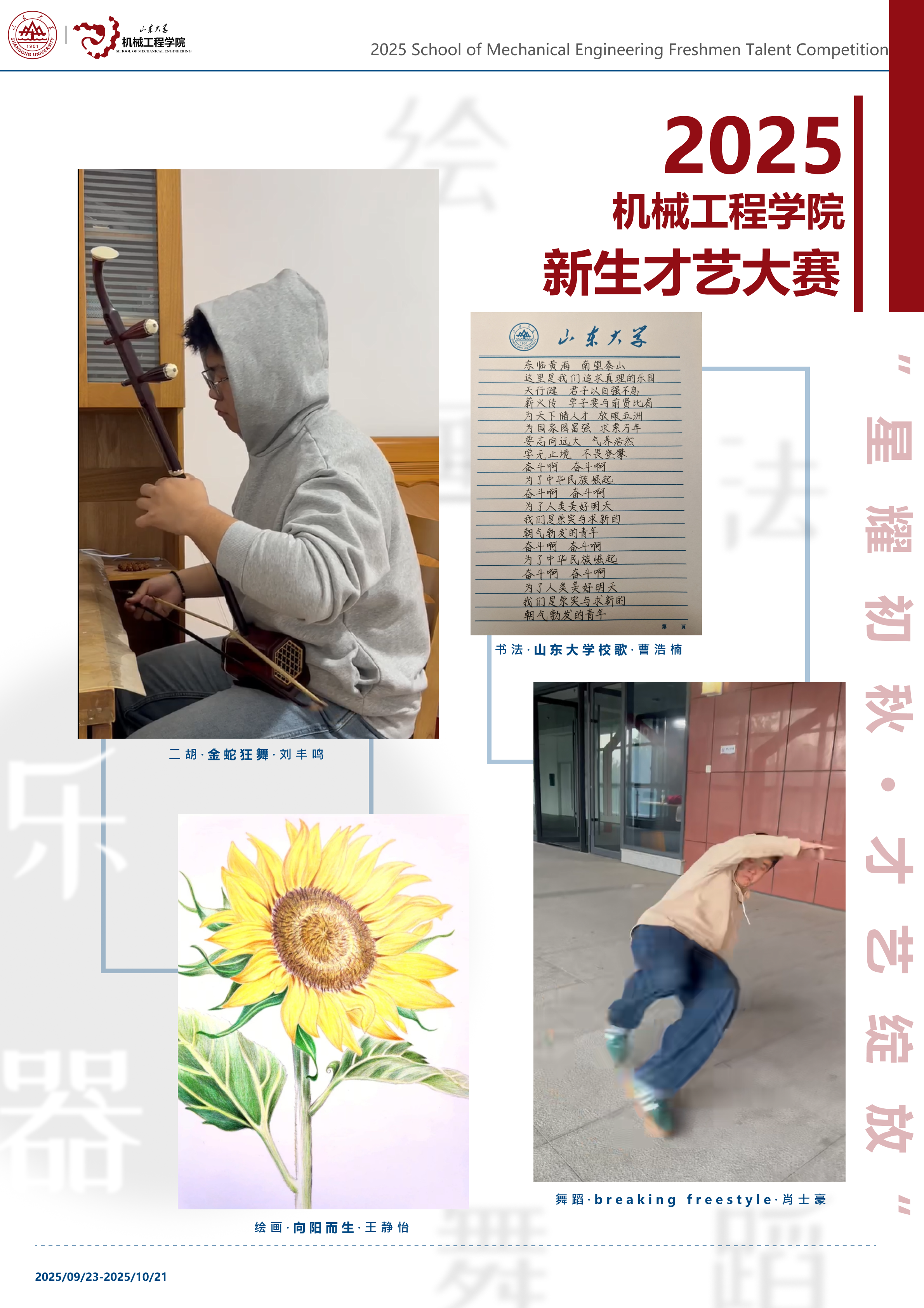 为展现2025级研究生新生的青春风采,必赢唯一官方网站在2025年9月23日至10月21日举办了新生才艺大赛。参赛同学以画笔描绘自然,以镜头记录美好,以舞步表达热爱,以书法传递情感,充分展现了机械学子积极向上、全面发展的精神风貌。本次展览作品涵盖绘画、摄影、书法、舞蹈、器乐等门类,内容丰富、形式多样,凝聚了同学们对生活的热爱与对艺术的追求。让我们共同欣赏同学们的精彩创作,感受青春的力量与必赢唯一官方网站的文化魅力。